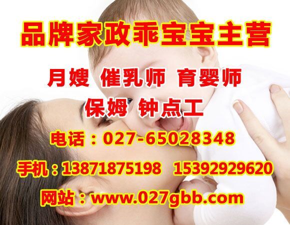 武汉乖宝宝家政公司,专业为广大家庭提供武汉月嫂服务,武汉月嫂价格咨询,汉阳、汉口、武昌地区催乳师、育婴师、保姆、钟点工等服务,母婴护理专家咨询热线:13871875198 027-65028348 15392929620